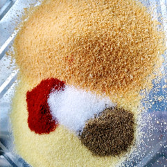 2) Prepare a tray or plate with all of the ingredients listed for the crumb coating. Take a handful of fishcake mixture and shape it into a ball. Flatten this ball slightly and then roll it on its side to make a shallow cylinder. Place this in the polenta mix and cover the fishcake well with crumbs. Repeat this until all of the fishcake mixture has been used.