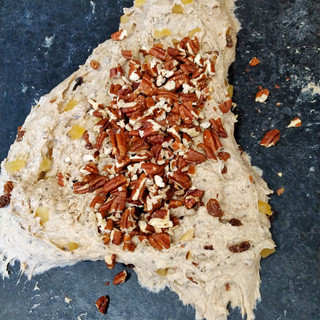 Tip the dough onto the worktop and knock the large air bubbles out of it. One at a time add the prepared ingredients to the dough and knead it well to evenly distribute the chunks.