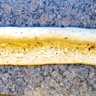 4) Tip the dough back onto the surface and gently knead it to knock out the air. Roll the dough into a rough rectangle shape, about 40x20cm. Grate the cheese and sprinkle both it and the dried chilli flakes across the surface of the dough. From the long edge, roll the dough into a long log. Be careful not to roll too tightly or the bread will struggle to expand in the second prove.