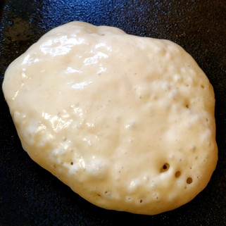 2) Heat the frying pan on a medium-low low. When hot, slowly pour a big spoonful of batter into the frying pan. (I could comfortably fit 3 pikelets in the frying pan, allowing room for flipping.) To get thicker pikelets, take your time pouring it into the frying pan. This allows the batter to cook on contact and will slow down the inevitable spreading. This also pops fewer bubbles, making for an airier pikelet.