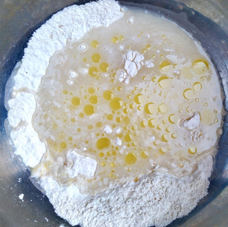1) In a big mixing bowl, combine the flour, yeast, salt and sugar. Give it a good whisk so that everything is well mingled, then make a well and pour in the milk and oil. Give everything a good whisk until it makes a smooth, batter-like mixture the will drop freely from a spoon but leave a thick, sticky layer. Cover the bowl and leave it somewhere nice an warm like a sunlit windowsill for at least an hour.