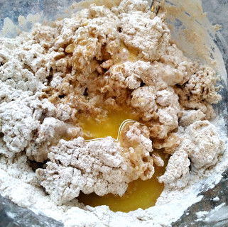 2) Melt the butter in the microwave and leave to one side to cool slightly. In a bowl, combine the white flour, toasted rye flour and salt. In a separate large mixing bowl, dissolve the yeast in the water. Add the flours to the water and stir a few times to combine loosely. Pour in the butter and continue mixing until the mixture forms a rough ball in the bowl.