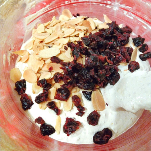 4) Fold in the ground almond and orange zest with a spatula. When that is well incorporated, add the cranberries and almond flakes.